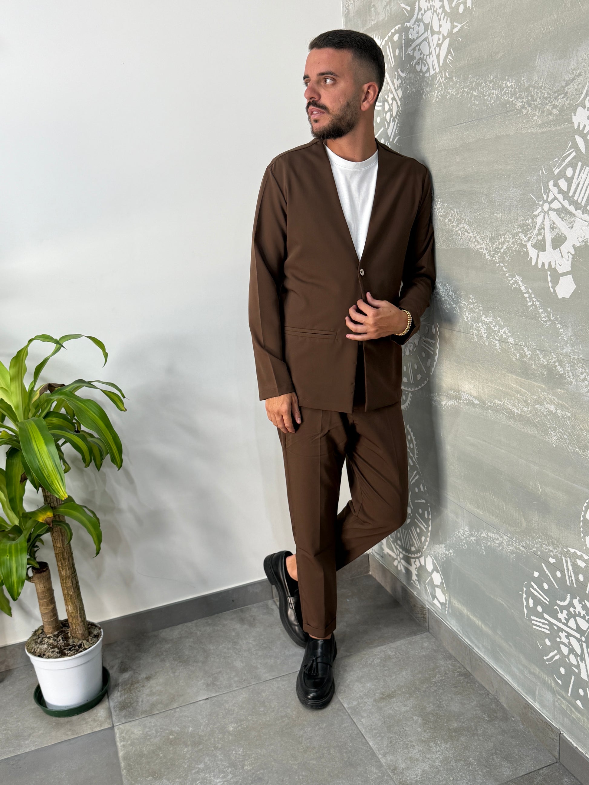 Abito con giacca monopetto e scollo a V in poliviscosa ed elasticizzato, pantalone modello Capri con risvoltino cucito, passanti in vita e mezzo elastico.