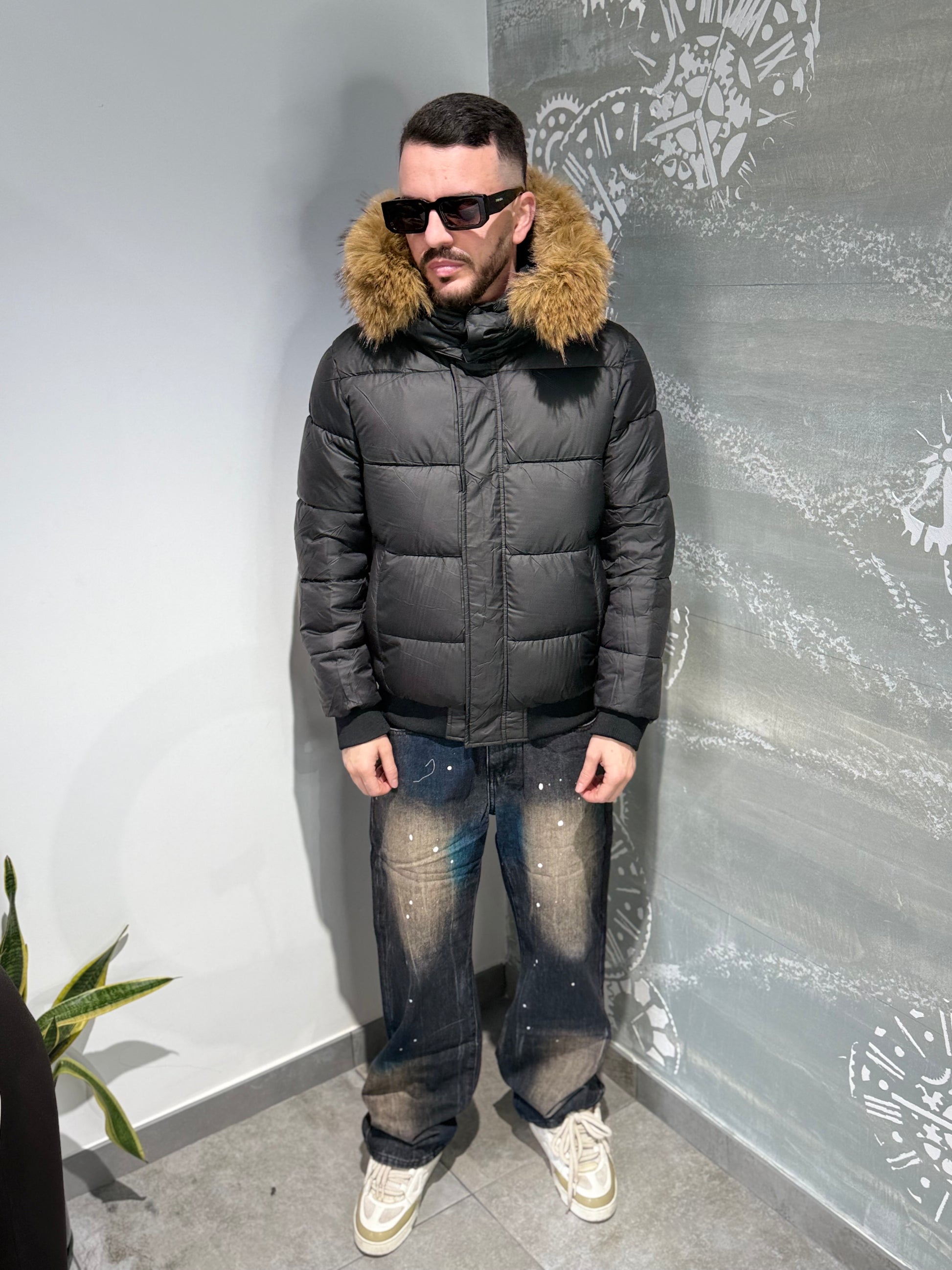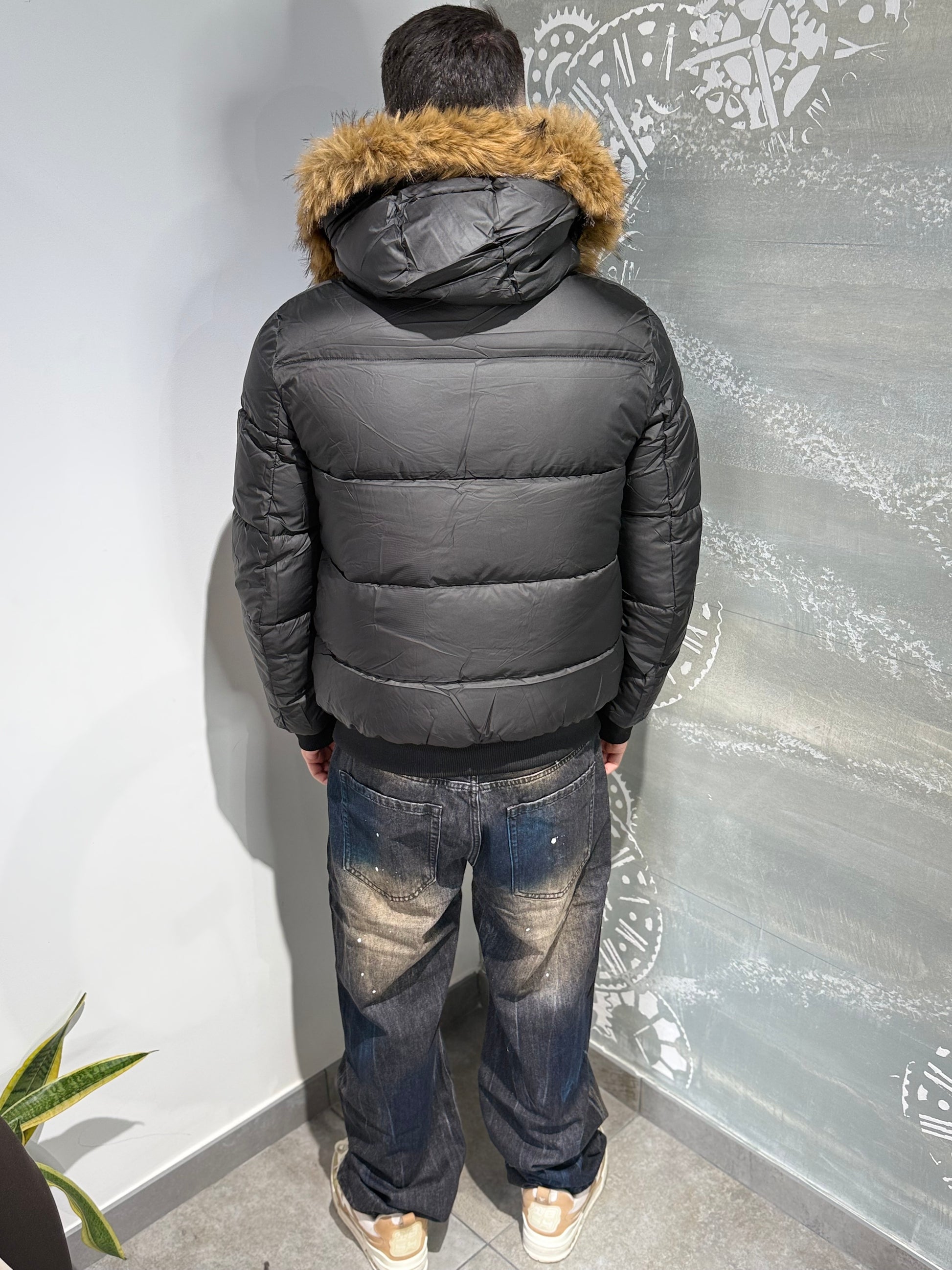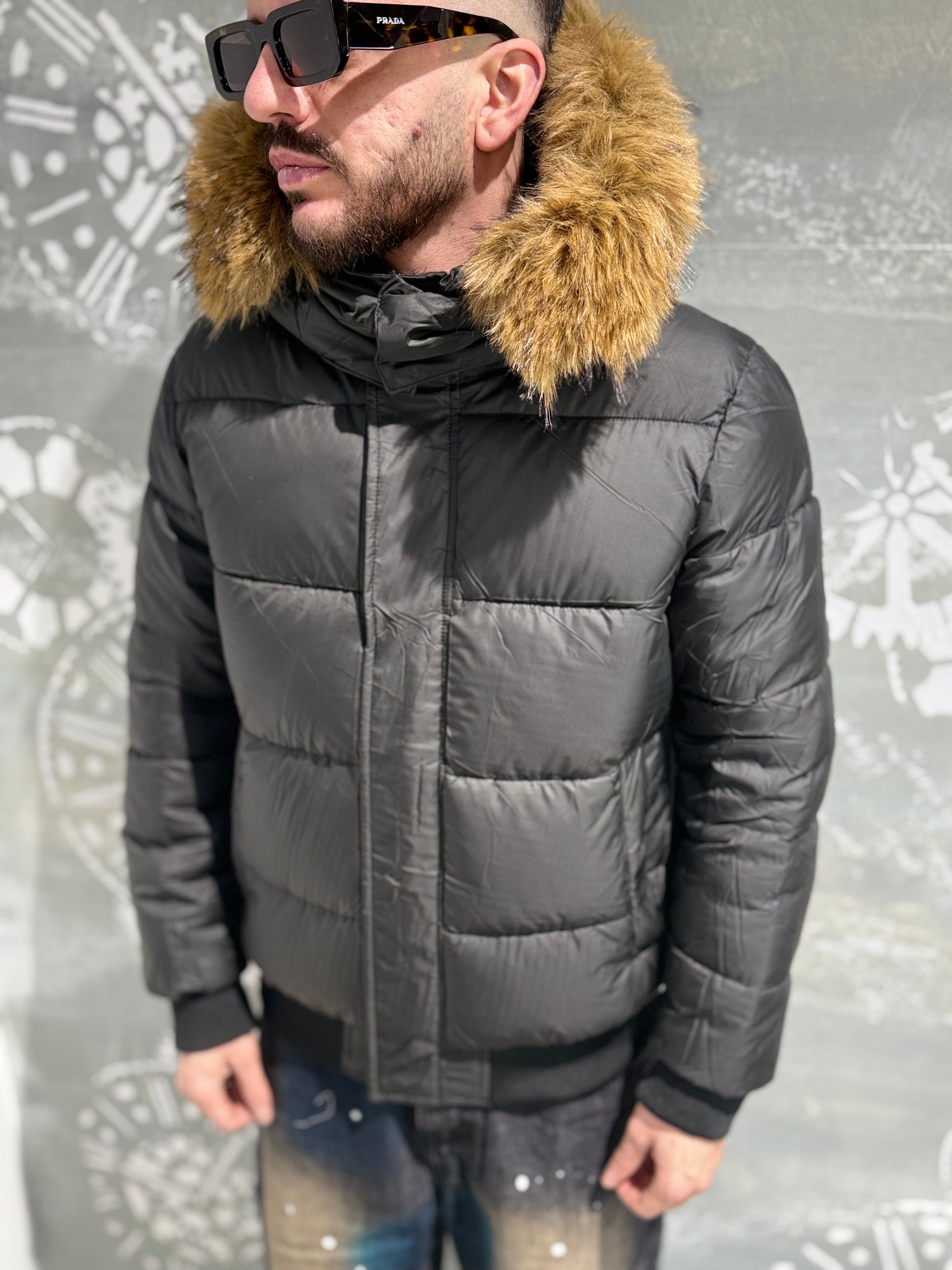 Giubbotto imbottito con cappuccio a pelliccia estraibile, doppia chiusura con zip e bottoni a pressione.