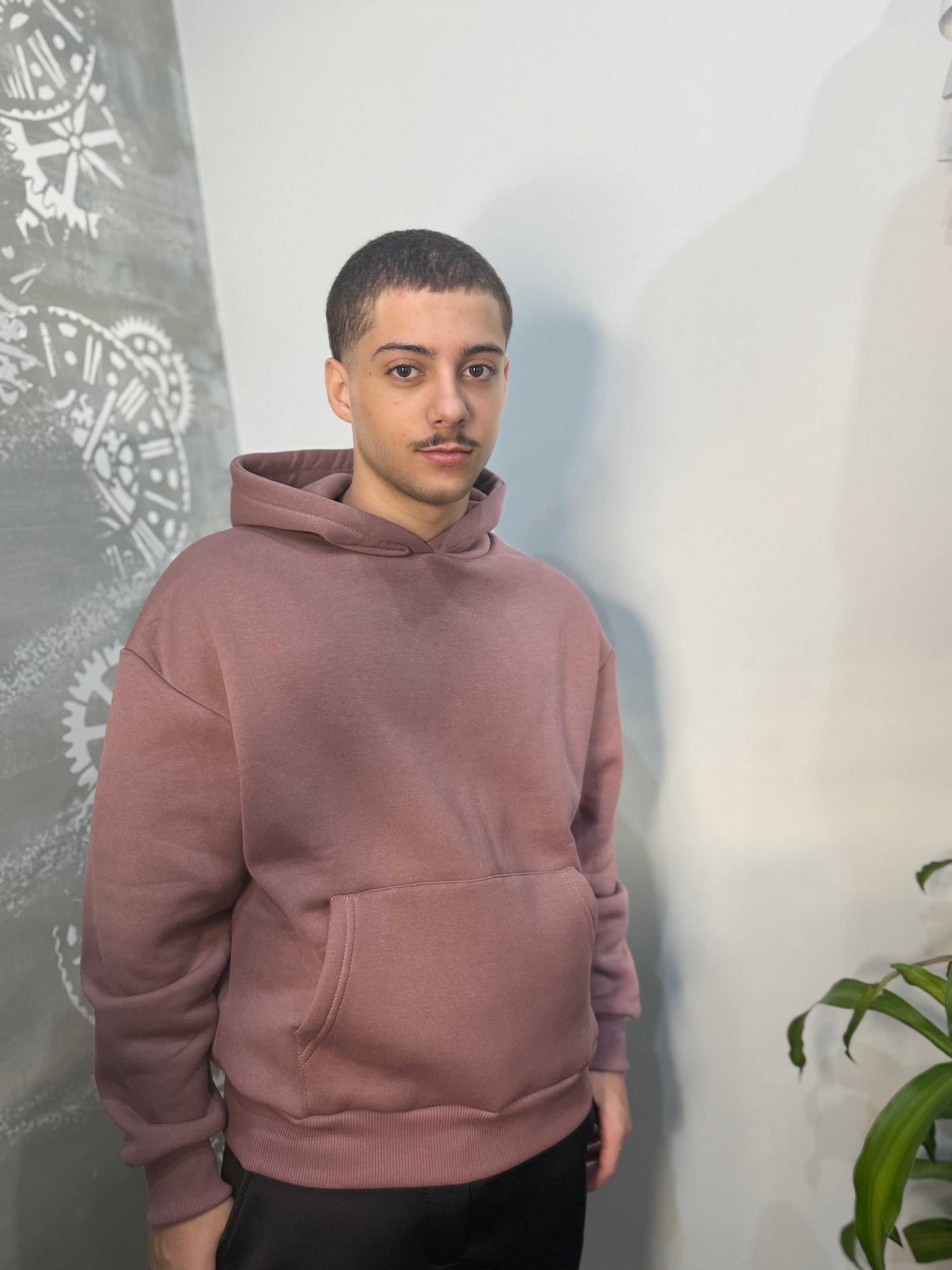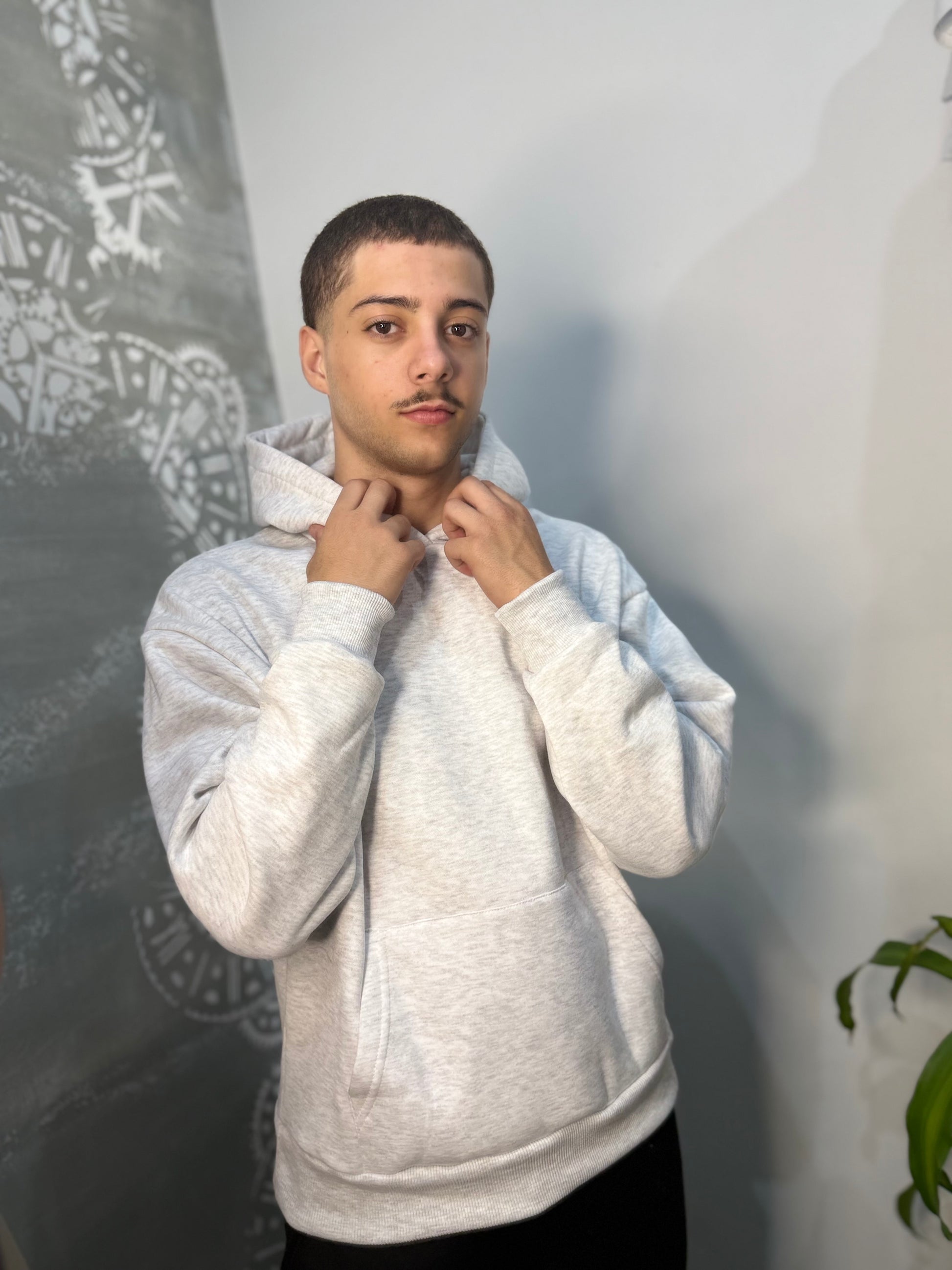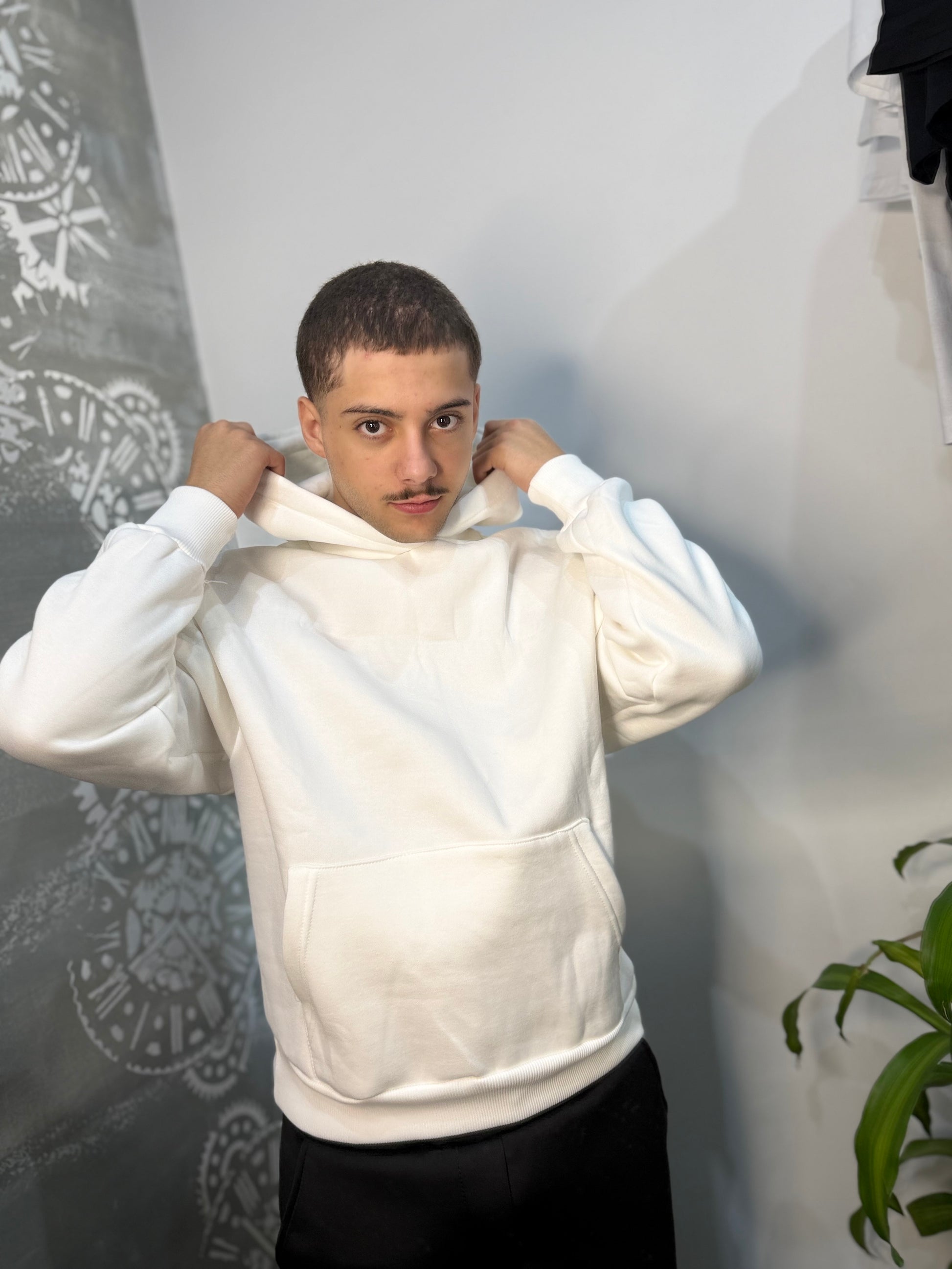 Felpa con ribattiture sulla balza, sulla manica e sul cappuccio, tasche frontali.