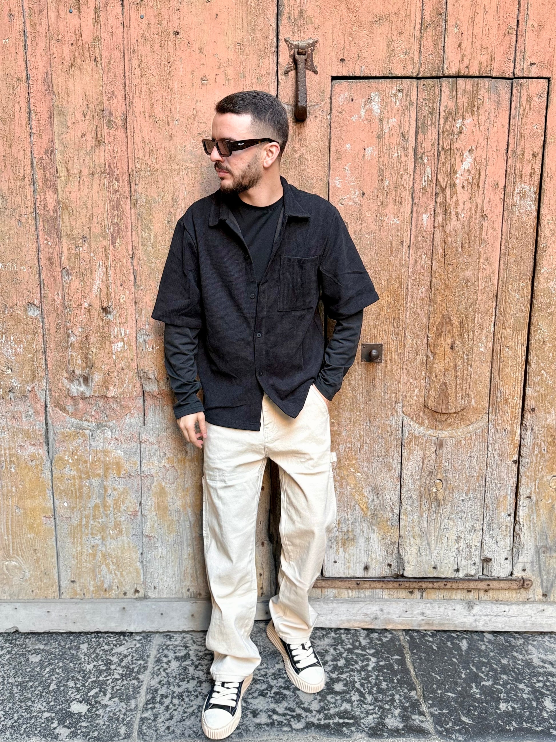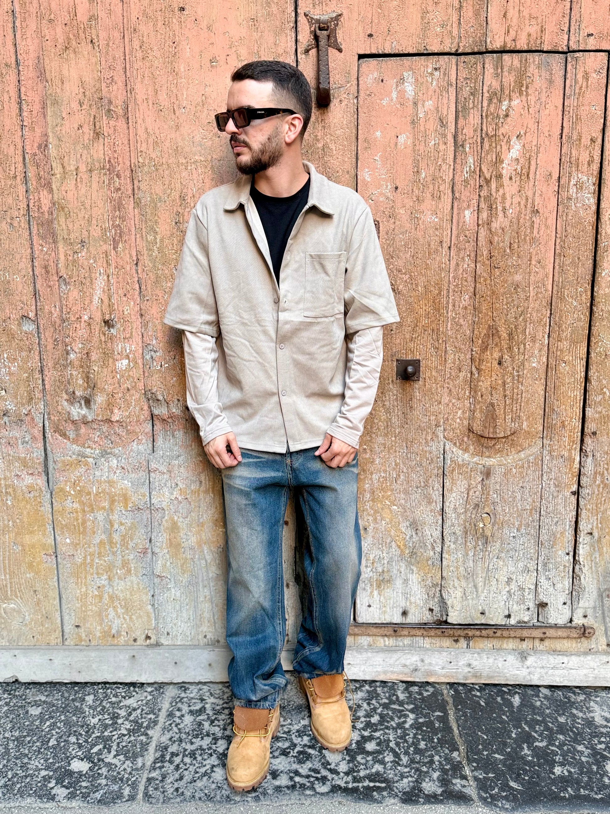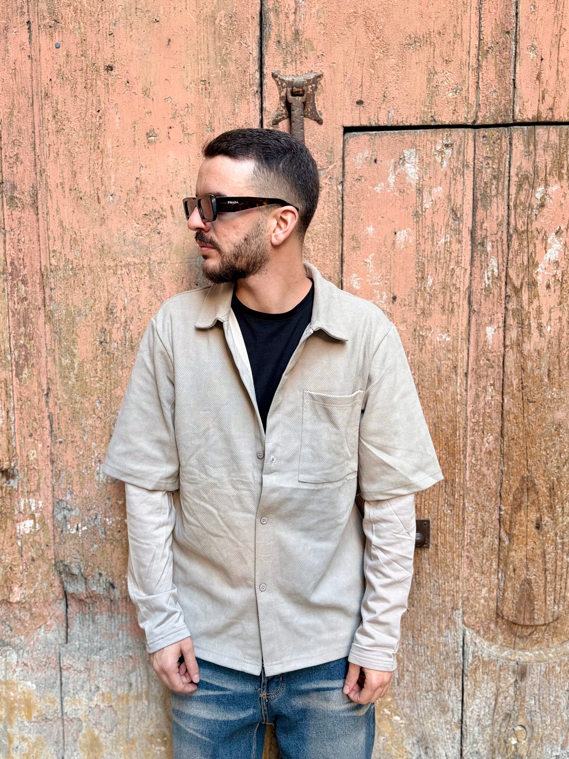 Camicia doppio tessuto in manica doppiata con taschino frontale lato cuore.