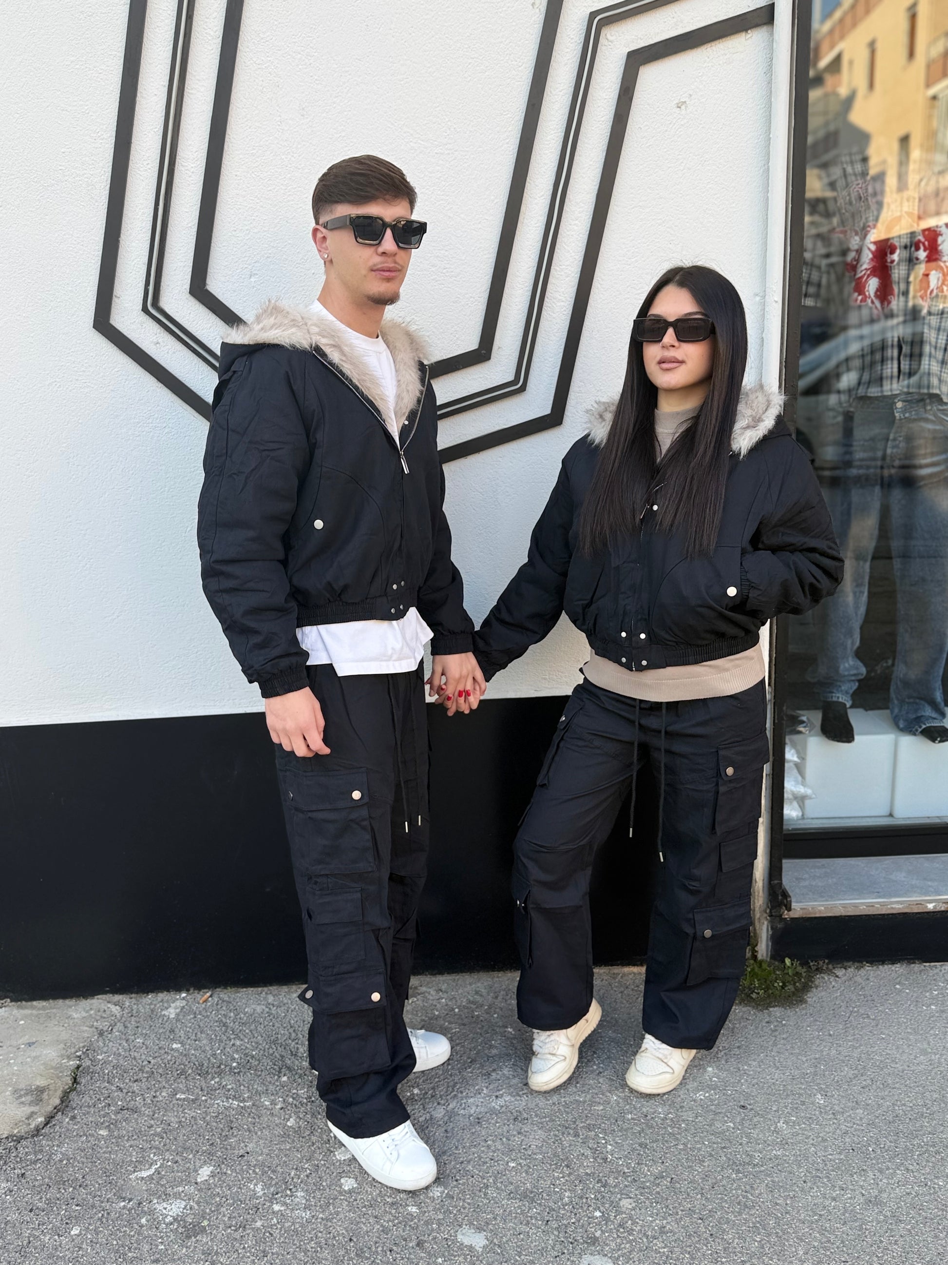 Cordinato crop con cappuccio in pelliccia, trapuntato e pantalaccio con tasconi laterali e fondo ampio.