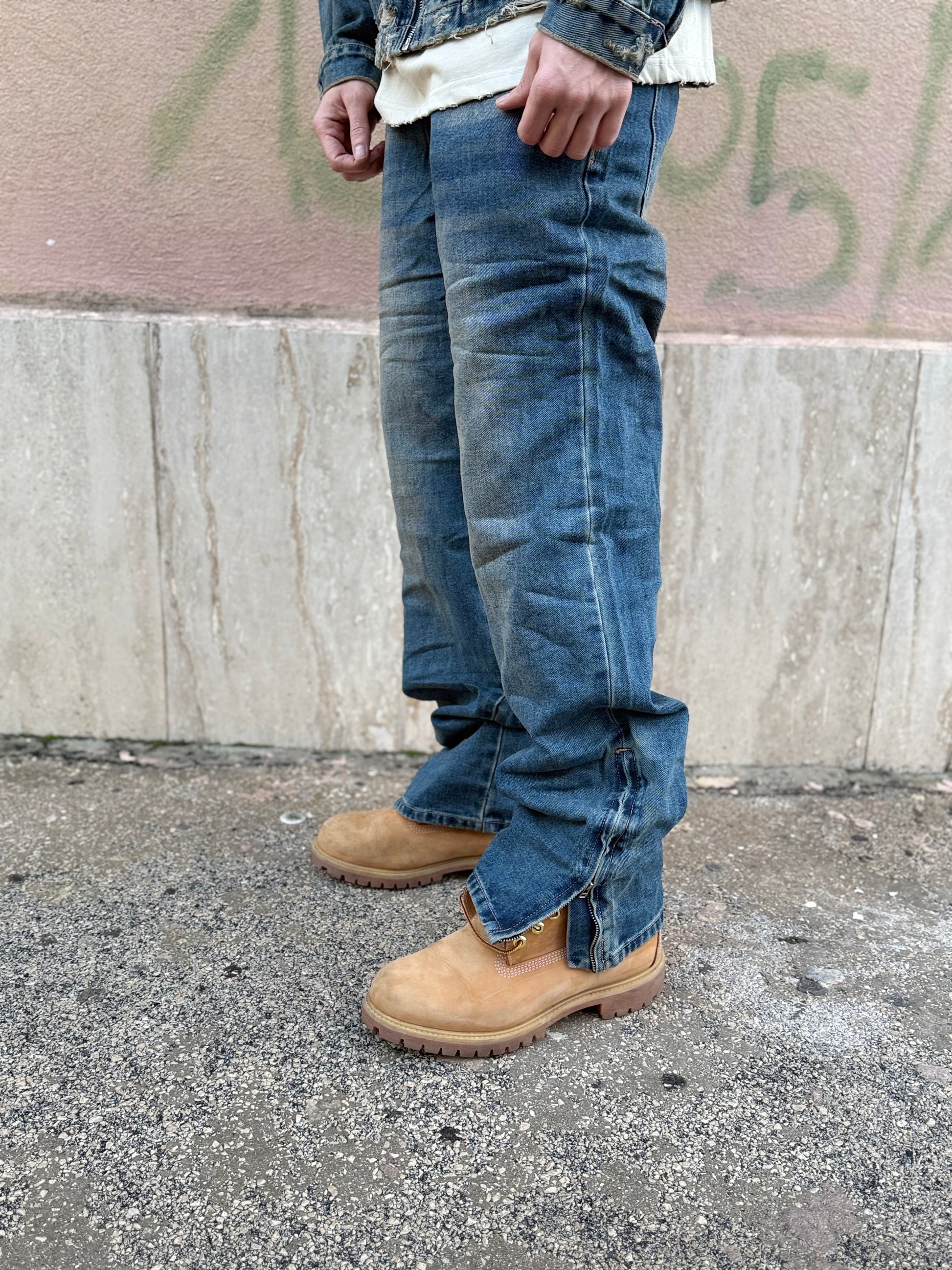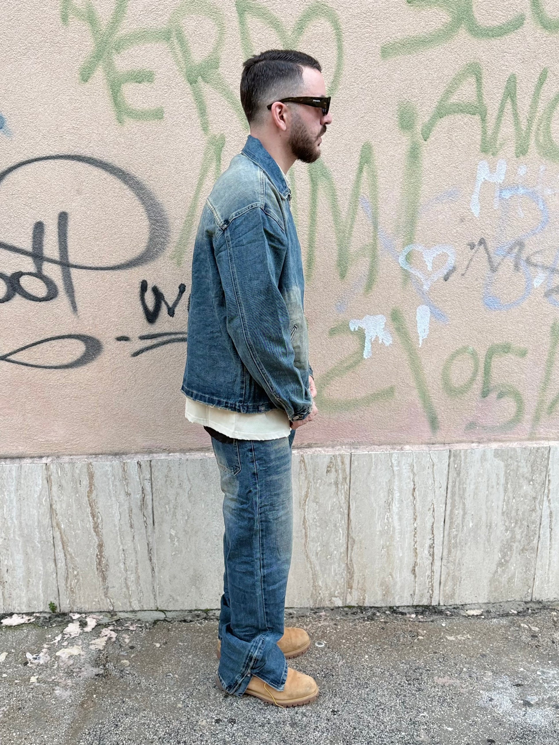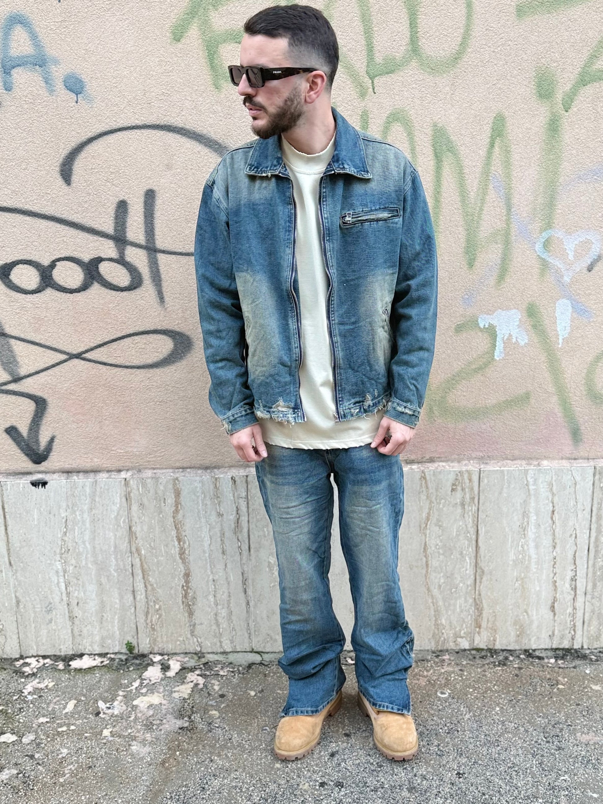 Cordinato in jeans con giacca semi crop e chiusura con zip e jeans fondo comodo con zip sul fondo regolabile.
