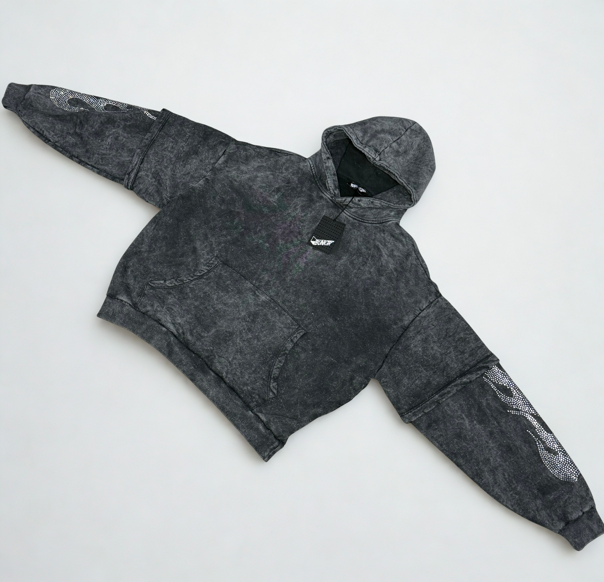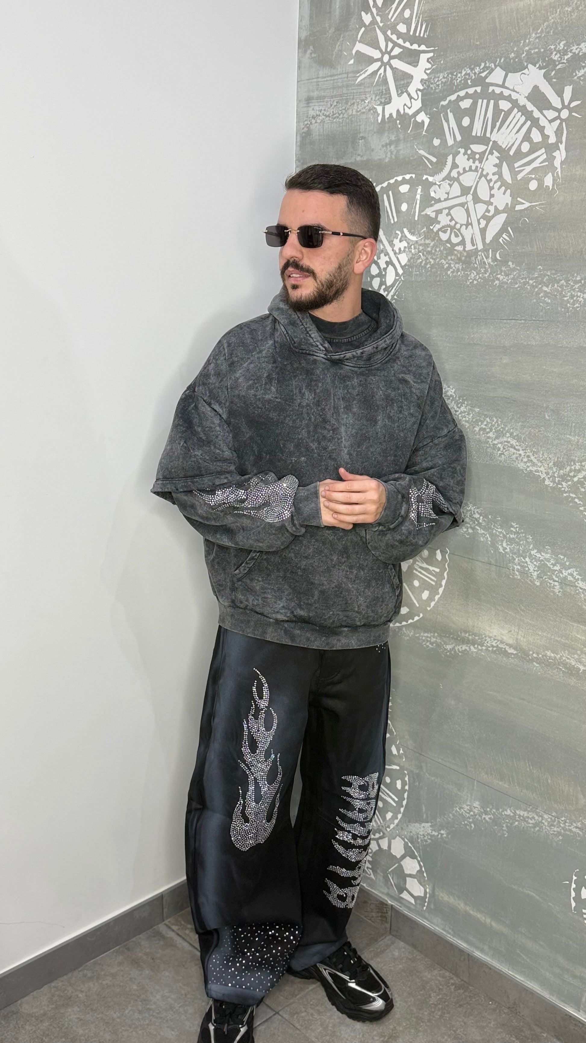 Felpa doppia manica slavata e con brillantini sulle braccia e cappucci; felpata all’interno.