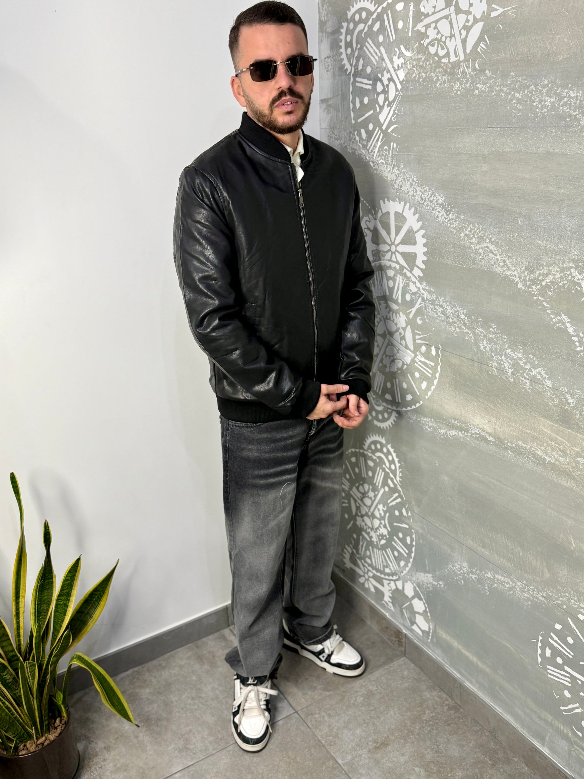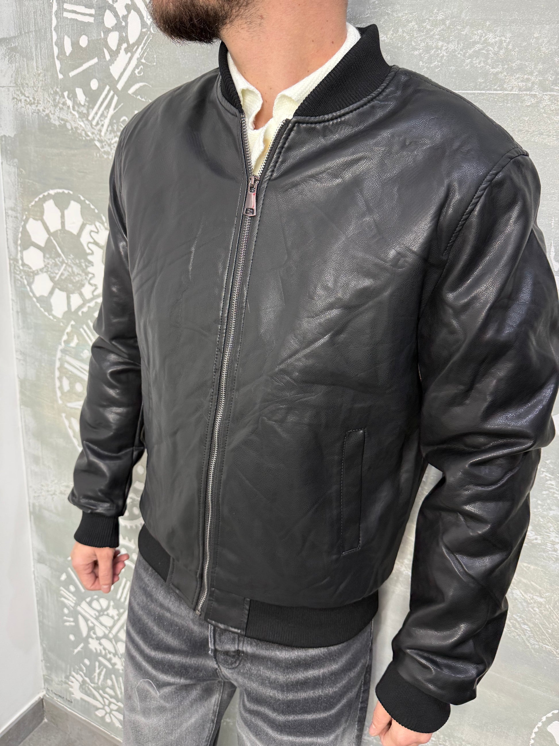 Jacket ecopelle con interno foderato con pelliccia, chiusura con zip e collo a costine.