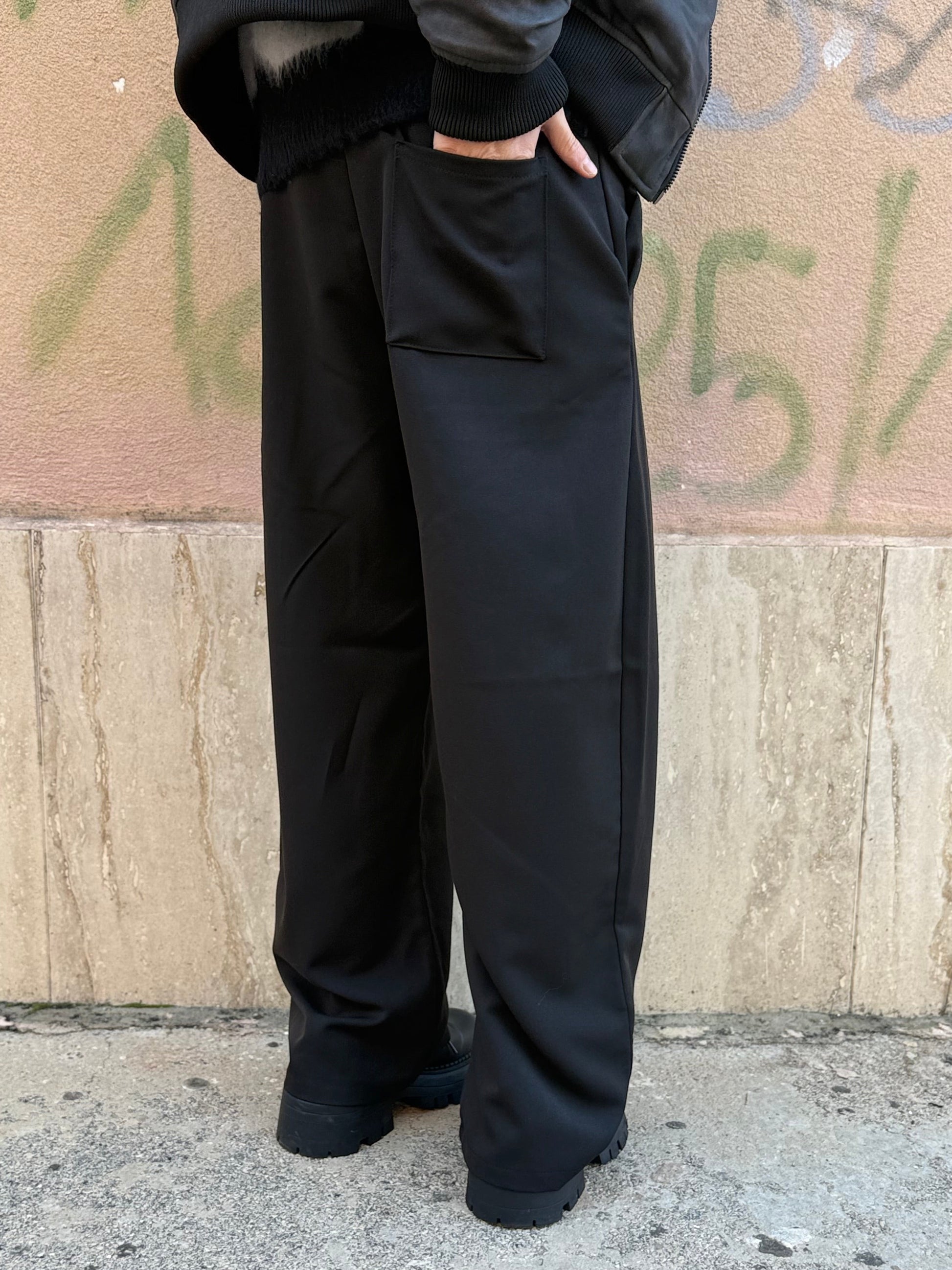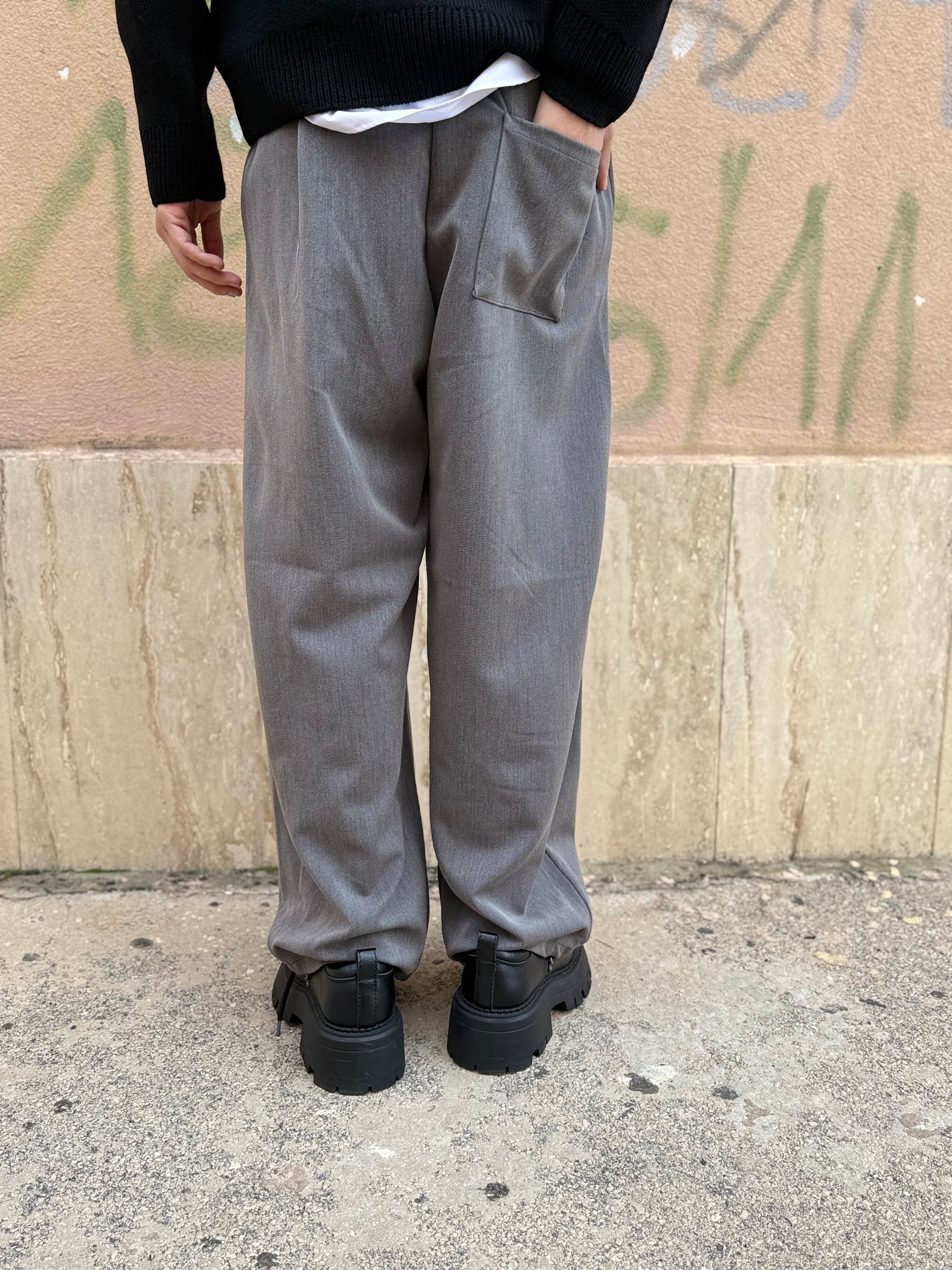 Pantalone con mezzo elastico, passanti in vita, tasche America e taschino sul posteriore, pence che scendono fino al fondo con effetto ballon.