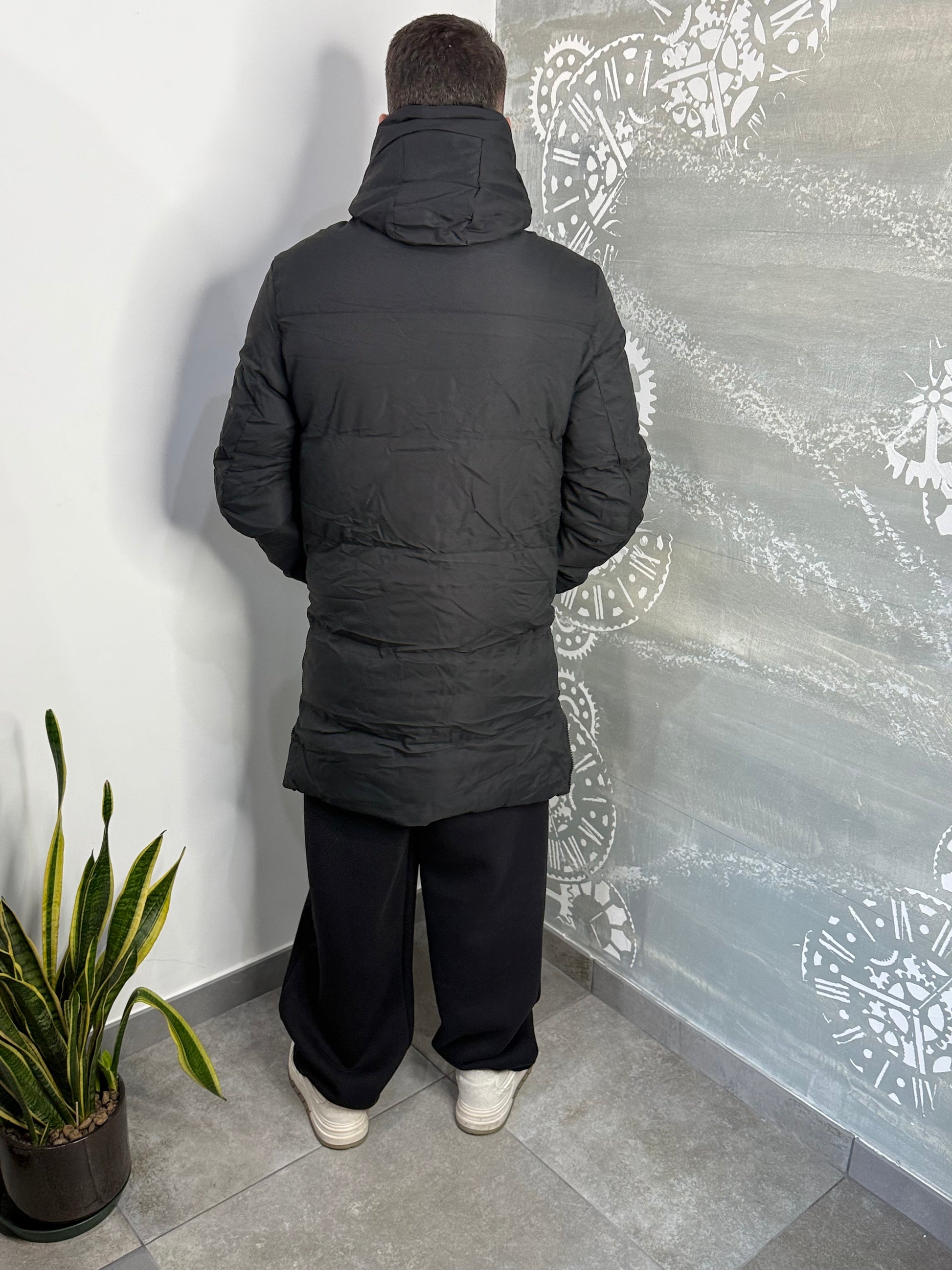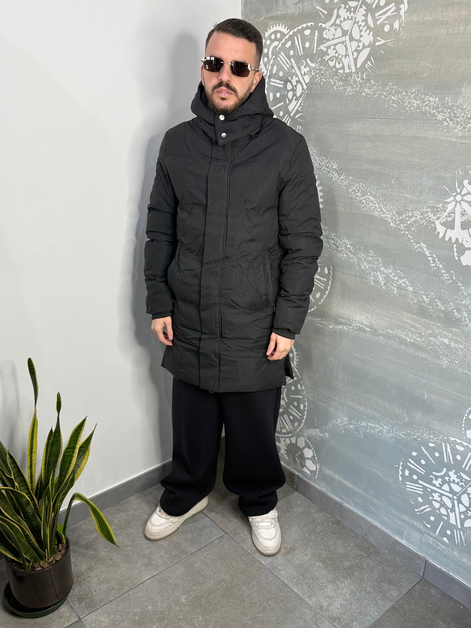 Giubbino lungo, imbottito con collo a cappuccio, doppia chiusura cerniera e bottoni a pressione e cerniera laterali per regolare la vestibilità.