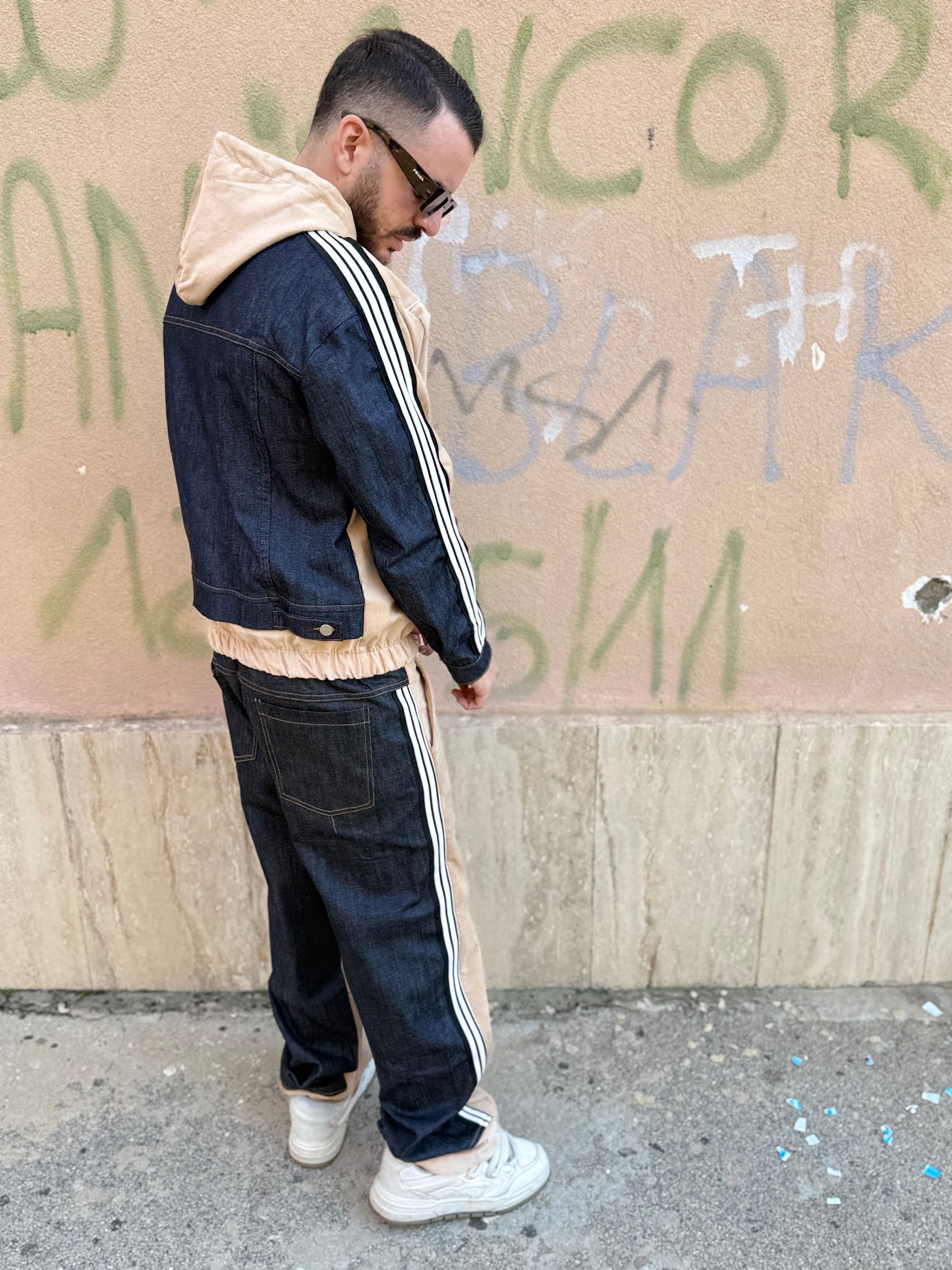 da un lato DENIM dall’altro ciniglia 😱, barre laterali, giacca semi crop e pantalaccio fondo comodo con culisse regolabile.